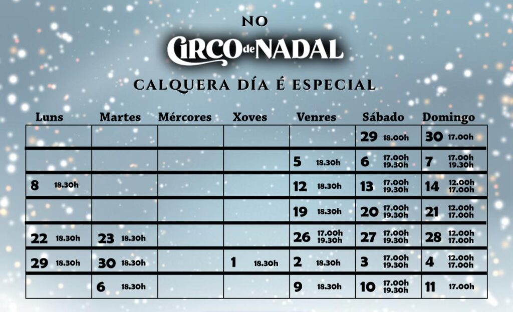 La carpa, instalada como cada año en Avenida de Castelao, ofrecerá funciones casi a diario hasta el 11 de enero de 2026. Los horarios varían según el día: