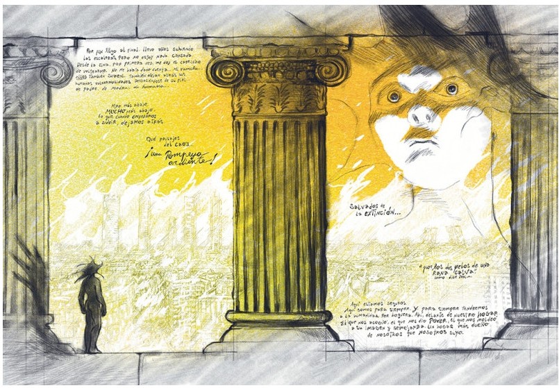 La narración fluye sin ataduras, no se sujeta a modas y formas habituales sino a una impronta personal, fogosa y torrencial. Todo con una técnica pictórica y mixta (usa recursos infográficos que no oculta). Impactante, por encima de todo.