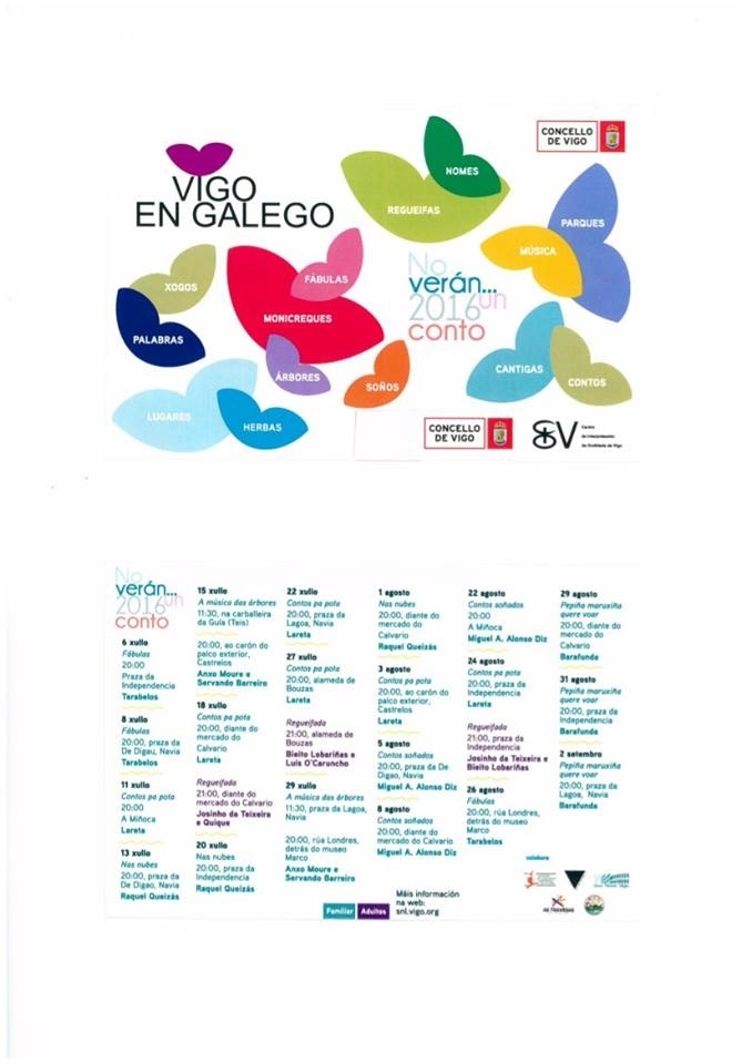 Un total de 22 actividades dirixidas a público infantil percorrerán desde o 6 de xullo ao 2 de setembro diferentes lugares da cidade: Independencia, prazas da De Digao e da Lagoa en Navia, A Miñoca, O Calvario, a carballeira da Guía en Teis, a Alameda de Bouzas e detrás do museo Marco. Contadas, monicreques, música… contos para soñar e voar coa nosa imaxinación, para acadar as nubes e para levar a pota… sempre contando coa música das árbores a as fábulas de onte e hoxe… E para o público adulto regueifas para divertirse e apreciar o enxeño de quen improvisa en verso.