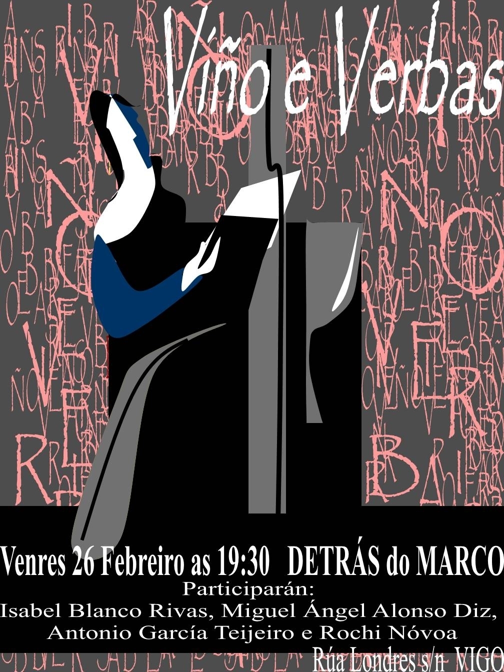 Viño e Verbas, que celebra a súa segunda edición, naceu da idea de compartir a creación literaria por medio da palabra, de forma dinámica e lúdica, compartindo tamén, unha contorna proclive ao faladoiro e o encontro. A intención dos organizadores é que o devandito encontro se celebre con carácter mensual en diferentes localidades e se lle de a oportunidade a participar a autores locais, ademais de convidar aos asistentes a participar no coloquio. Nesta ocasión en Vigo participarán: