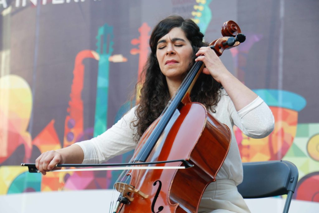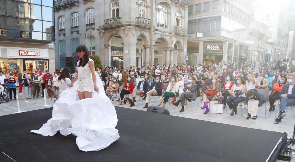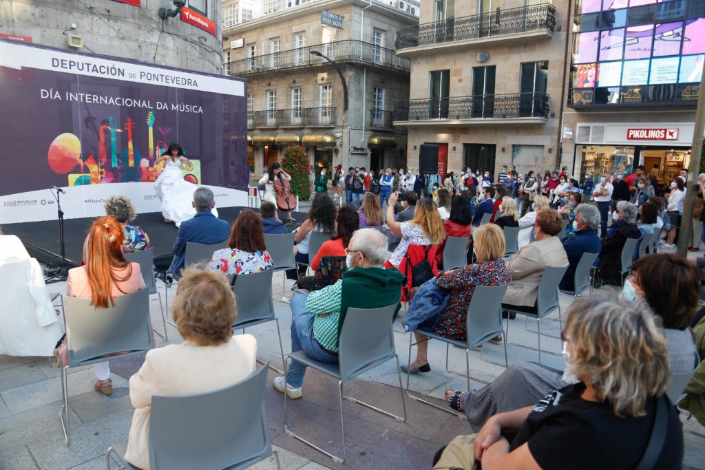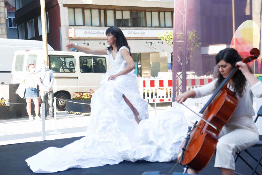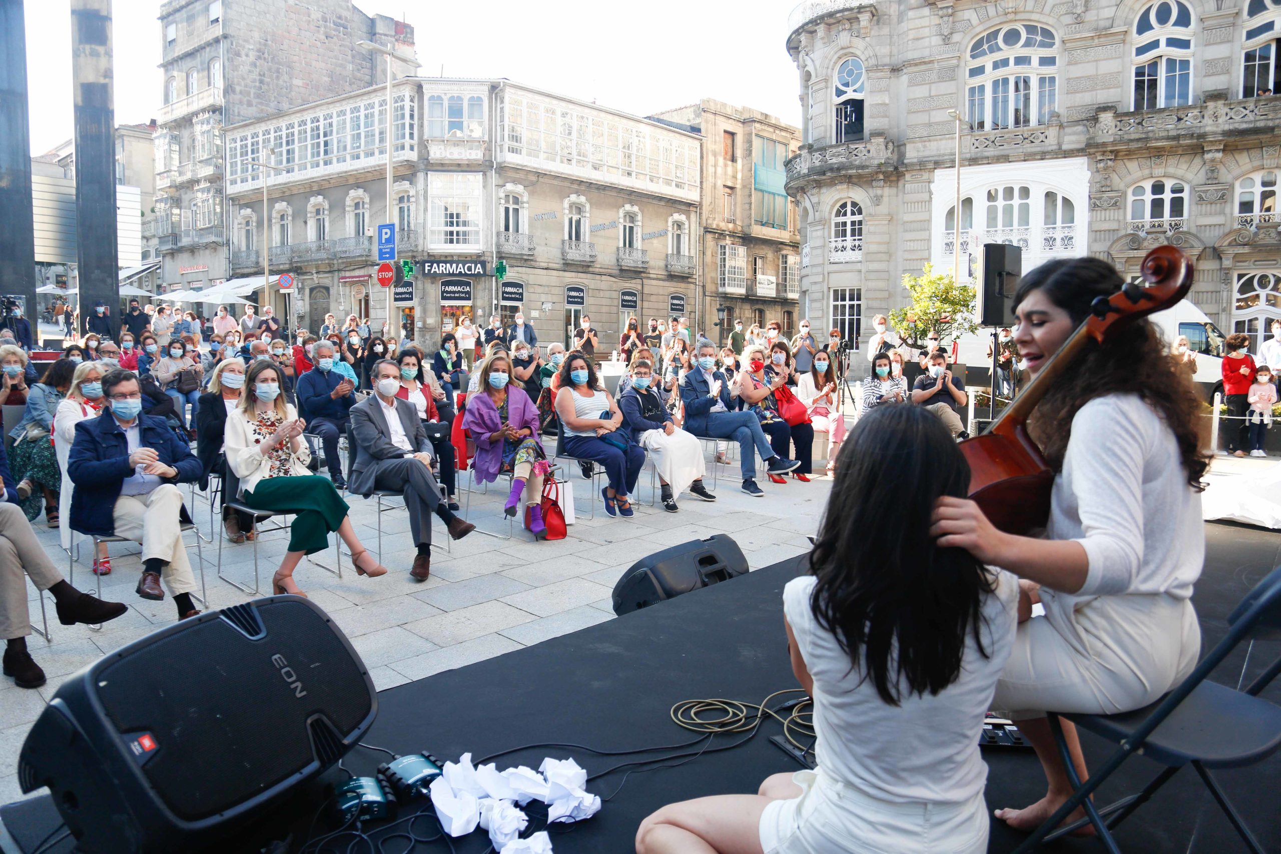 Vigo celebró a última hora de la tarde de este viernes su primer concierto en la nueva normalidad. La Porta do Sol fue la encargada de acoger la actuación ‘Quen canta o seu mal espanta’, protagonizada por la violonchelista y artista visual Macarena Montesinos y la coreógrafa e intérprete Nuria Sotelo. Una iniciativa impulsada por la Deputación de Pontevedra para celebrar el Día de la Música y aprovechar para devolver la cultura, tan afectada durante el confinamiento, a las calles.