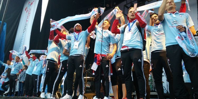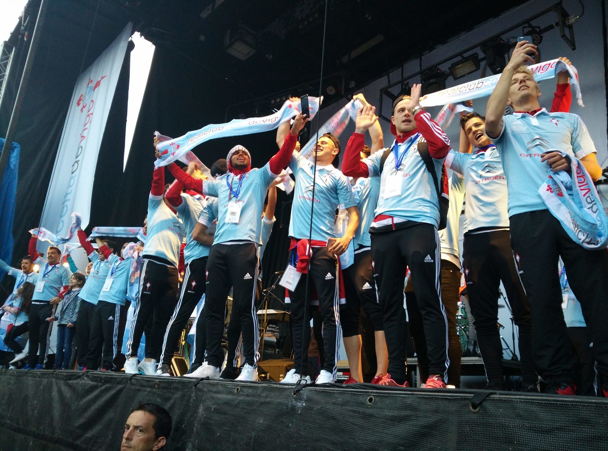 Durante la fiesta en la plaza de América, todos los jugadores del Celta desfilaron por el escenario y pronunciaron unas palabras ante el público allí congregado. Pero lo mejor estaba por llegar. Entre otras cosas por el rap que, de manera improvisada, ofrecieron Bongonda y Guidetti. Al final, la actuación que más entusiasmó al celtismo no corrió a cargo de los músicos que allí tocaron, sino de los dos jugadores celestes.