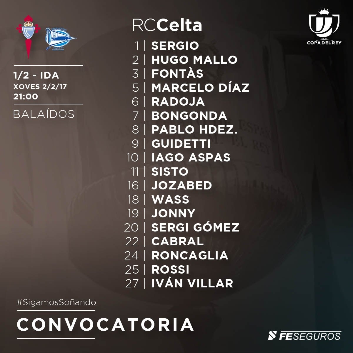 Para cubrir la baja del lesionado Rubén Blanco, una vez más entra en la convocatoria el canterano Iván Villar. Por su parte, Hjulsager aún no ha completado su proceso de adaptación y Berizzo ya anunció que sería «precipitado» que estuviera en este importante partido. Eso sí, no se descarta que debute en el encuentro ante el Real Madrid del próximo domingo.