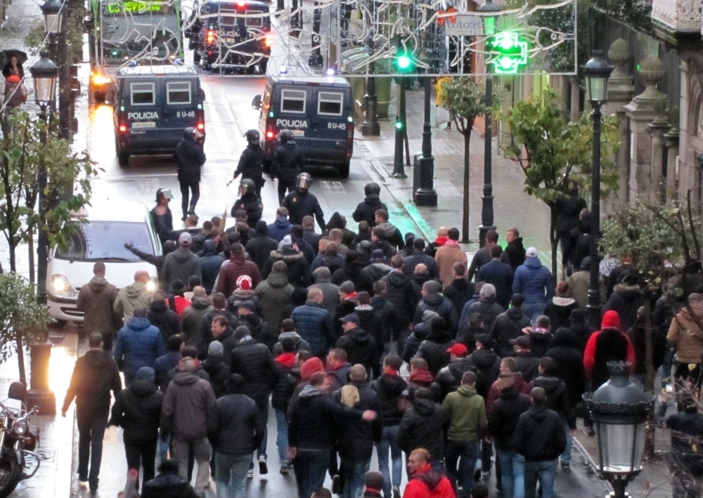 Un importante dispositivo policial llevó a cabo este jueves el traslado de unos 300 aficionados del Standard de Lieja desde el centro de Vigo hasta el estadio de Balaídos. Durante el recorrido, agentes de la UIP realizaron varias cargas que se saldaron sin heridos ni detenidos. Los problemas se registraron cerca del cruce de Peniche, al final de la calle Pi y Margall, cuando varias dotaciones policiales cargaron contra varios aficionados y les obligaron a regresar al grupo que caminaba custodiado.