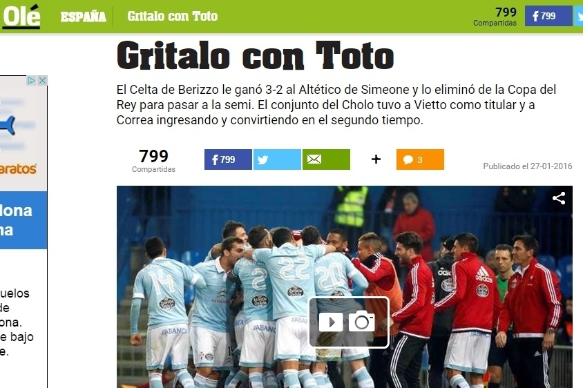 Por último, cabe destacar que los principales diarios deportivos madrileños también le dieron espacio a la victoria del Celta, como no podía ser menos. «Berizzo se vengó de Simeone», señaló el diario As en la parte superior de su portada. El Marca, por su parte, le brindó bastante más espacio, ya que la foto principal es para los celestes y está acompañada con el siguiente titular: «Celestial».
