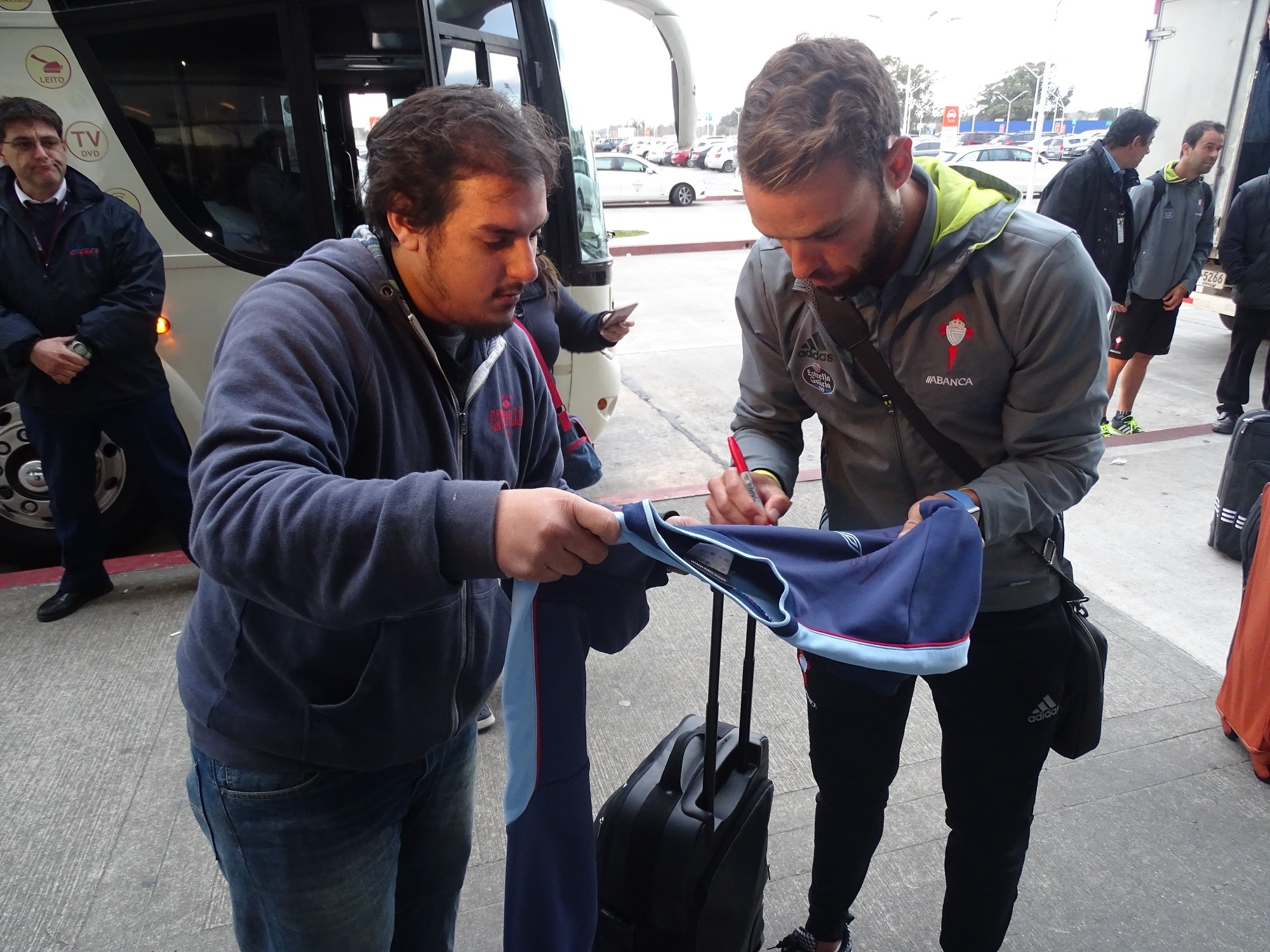 Los jugadores del Celta tuvieron la agradable sorpresa de encontrarse con aficionados célticos en el aeropuerto a su llegada a Montevideo. Sergio agradece este apoyo. «Vinieron a recibirnos al aeropuerto algunos aficionados, lo que significa que hay gente aquí que vive el celtismo de una manera ilusionante. Es difícil que estén con nosotros habitualmente e intentaremos disfrutarlo y estar lo más cerca de ellos que sea posible», explicó.DSC08615DSC08625DSC08626DSC08631