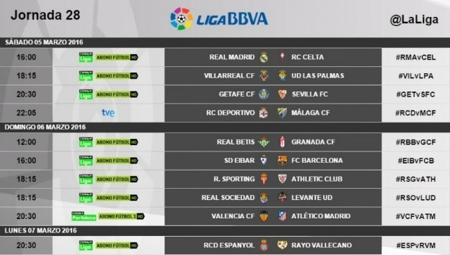 La siguiente jornada, la vigésimo novena, el Celta recibirá en el estadio de Balaídos a la Real Sociedad de Eusebio Sacristán. El encuentro también será en sábado (12 marzo) por la tarde, pero un poco más tarde, a las 18:15 horas. Será el reencuentro de Euseubio, que pasó por el banquillo del equipo vigués en Segunda División, con la parroquia local. También será un enfrentamiento especial para Juan Carlos Andrés, el entrenadoe vigués que ejerce de segundo entrenador en el club donostiarra.