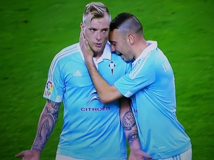Cuando el cuarto árbitro levantó la pizarra electrónica y anunció que el jugador sustituido sería el número 11, Guidetti comenzó a mostrar su disconformidad extendiendo los brazos en señal de protesta. Inmediatamente Iago Aspas se acercó para consolarle, como se aprecia en la imagen, pero el delantero seguía mirando al banquillo con enfado.