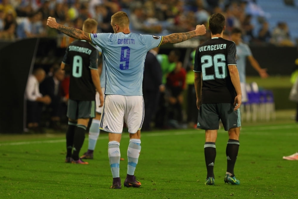 El delantero, ex del Feyenoord y muy poco querido en Ámsterdam, marcó uno de los goles del Celta en ese encuentro y al celebrarlo se llevó las manos a las orejas en respuesta a los silbidos e insultos de la afición local, que ya habían comenzado cuando el jugador saltó a calentar en la primera parte. El gesto enfureció aun más a una parte de la hinchada del Ajax y tras el encuentro algunos aficionados insultaron gravemente a Guidetti y a su familia a través de las redes sociales.