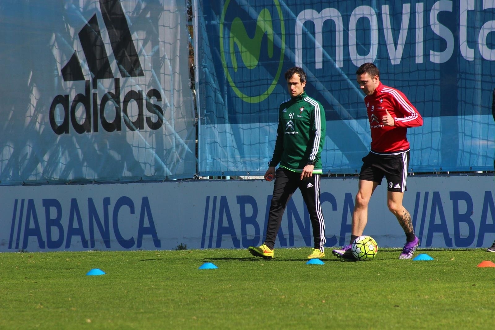 Tras dar un par de vueltas al campo, Aspas ejecutó varios ejercicios. Comenzó con movimientos de desplazamiento laterales y, a continuación, conducción del balón con poca intensidad, primero en línea recta y después sorteando unos pequeños conos. Por último, realizó unos pases con el interior de ambos pies bajo la atenta mirada del recuperador.