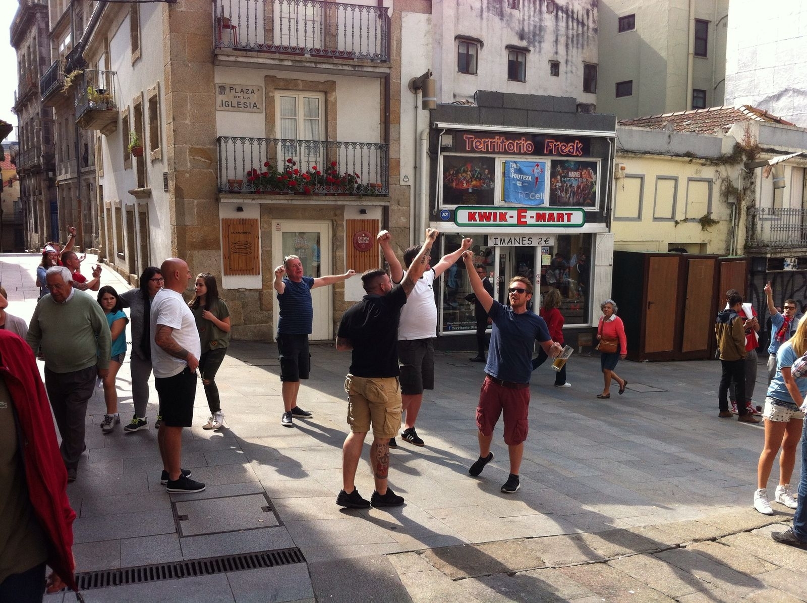Como es lógico, los hinchas ingleses buscaron establecimientos más económicos y cómodos. Algunos optaron por las terrazas de la zona. Otros se congregaron en la plaza de la Colegiata, donde hasta ahora han convivido en perfecta armonía con los muchos aficionados del Celta que luciendo camisetas de su equipo decidieron comenzar una jornada festiva bebiendo unas cervezas en el Casco Vello.