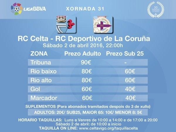 La taquilla de Balaídos permanece abierta de lunes a viernes en horario de 10 a 14 y de 17 a 20 horas. Las entradas podrán adquirirse en cualquier momento del día a través de la web www.celtavigo.org/taquillaCelta.