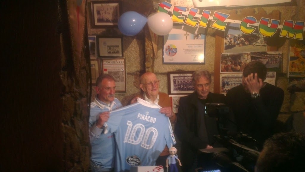Ignacio Pinacho no es el socio más antiguo del Celta -es dueño del carnet número 141 porque se fue a trabajar a Catoira y perdió su antigüedad-, pero posiblemente sí sea el más veterano. Este lunes, acompañado de sus seres queridos, recibió un sentido homenaje en el que se le entregó una camiseta con el dorsal 100 firmada por los jugadores de la primera plantilla. Jugadores como Fontás, exfutbolistas como Rodilla o la consejera Carmen Avendaño no se perdieron este bonito acto.