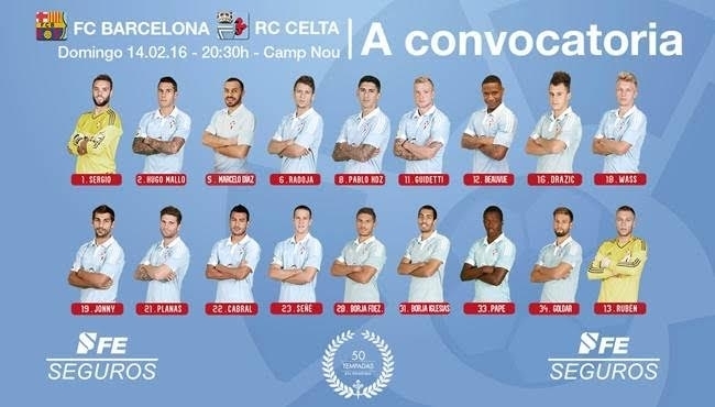 La plaga de bajas con la que se plantará el Celta en el Camp Nou (20:30) ha obligado al entrenador celeste a echar mano de la cantera. Y es que solo están disponibles 14 de los 20 jugadores de los que forman la primera plantilla céltica. A las ausencias de los lesionados Fontás y Nolito, se unen este domingo las de los sancionados Iago Aspas, Theo Bongonda, Fabián Orellana y Sergi Gómez.