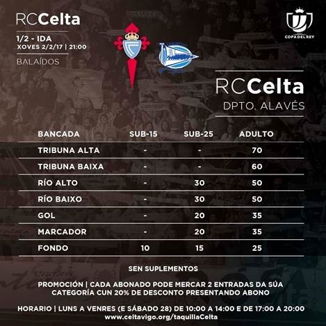 El club espera que Balaídos vuelva a presentar una gran entrada ante el Alavés, como ocurrió ante el conjunto blanco, y por este motivo todos los abonados celestes, que no necesitan suplemento para asistir al encuentro a pesar de que se considere la cita Día del Club, podrán retirar dos entradas para su misma categoría y de la grada que elijan, salvo Fondo, hasta final de existencias con un veinte por ciento de descuento.