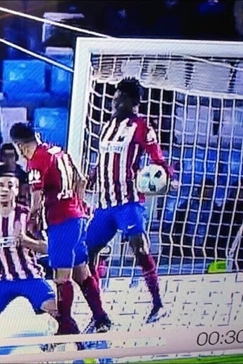 Todas estás preguntas son necesarias a la hora de establecer si la mano conlleva infracción. Partimos de un golpeo claro de Thomas con el brazo extendido e involuntario. El agravante que, para el que escribe determina la acción, es que el jugador del Atlético no hace ningún gesto para evitar el contacto del esférico con el brazo. Salta en el área con el brazo abierto, lo que es una temeridad y no lo recoge cuando observa que el balón está a punto de golpearlo. Corta su trayectoria y lo desvía en otra dirección. Por lo tanto, existe el contacto de la pelota con la mano y no hace nada para evitarlo. Conclusión: penalti. O, al menos, así me lo explicó una vez un colegiado.