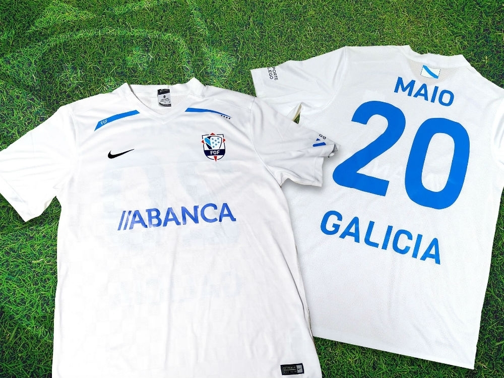A primeira camiseta recupera a cor branca na súa totalidade en recordo e homenaxe a aquela dos anos 20 (1922) da primeira selección galega. No diseño aparece un pequeno detalle en azul na parte superior da camiseta coas iniciais da Federación Galega de Fútbol e catro cruces que representan ás catro provincias galegas.