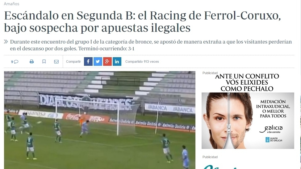El diario madrileño asegura en un artículo publicado este sábado que «existen muchísimos indicios que invitan a sospechar que el resultado estuvo predeterminado para que venciese el Racing de Ferrol e incluso para que lo hiciera por dos o más goles de diferencia en la primera parte». Recordemos que el Coruxo se adelantó en el marcador en ese partido y que el Racing de Ferrol le dio la vuelta al resultado antes del descanso al anotar 3 goles por medio de Joselu.