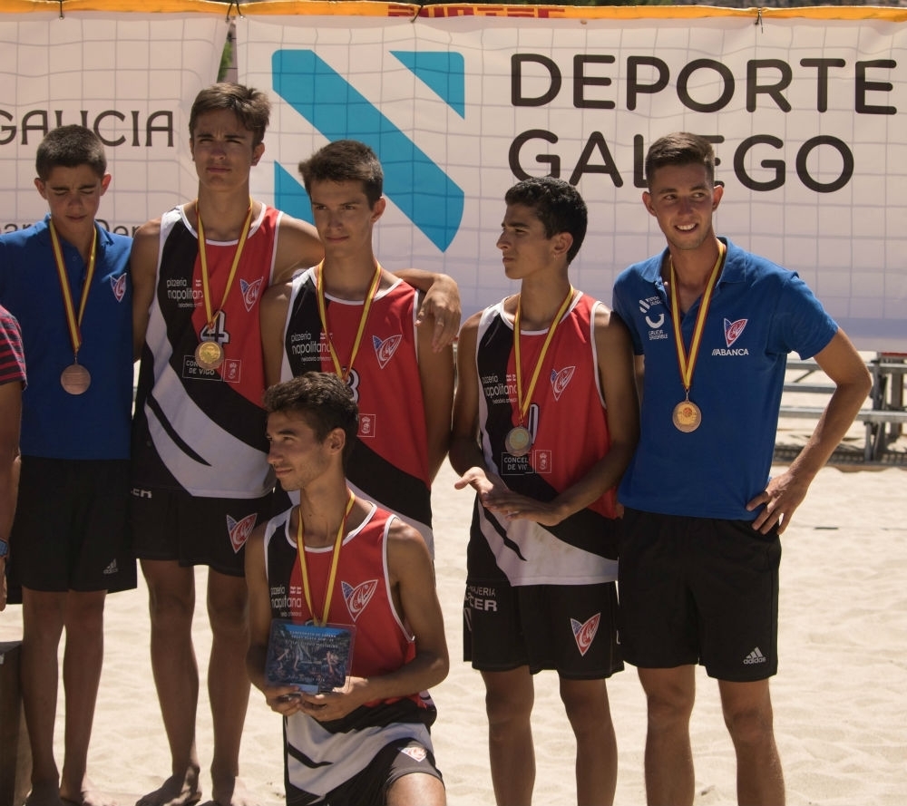En esta categoría los equipos están formados por seis jugadores, participando en el juego simultáneamente tres. Como todos los años, los distintos equipos pertenecientes al Club Vigo, después de su participación en el voleibol sala, se dividieron para participar en el Campeonato Gallego de su categoría de vóey-playa, lo que significó que a lo largo de los meses de junio y julio estuvieron disputando la competición gallega.