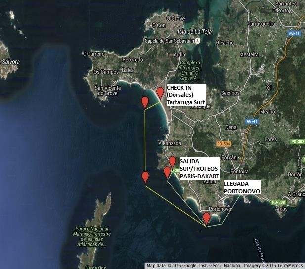 La prueba dará comienzo a las 15:30 desde la playa de A Lanzada en frente a las oficinas de Tartaruga Surf, la salida se dará con las piraguas cerca del agua y los participantes a unos 50m que tendrán que recorrer para montar en la piragua y dirigirse a la línea de meta que estará situada en el puerto de Portonovo a unos 15km. La categoría de Padle Surf tomará la salida desde la playa de Major con dirección Portonovo.