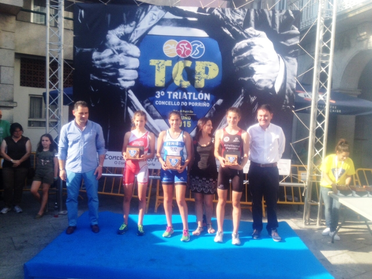 Na proba feminina, Camila Alonso (Tríatlon Ferrol) acadou unha cómoda vitoria nunha proba que se decidiu nos últimos quilómetros de bicicleta. Da auga saían nos primeiros postos as que ao final loitaron polo triunfo (Iria Rodríguez, Rebeca Carnota e Camila), e a bicicleta foi definitiva. Camila atacou a falta de tres quilómetros para poñerse en cabeza e chegar con vantaxe á última transición. E na carreira a pe aumentou as diferenzas coas deportistas que viñan por detrás. Así, Camila logrou a primeira posición cun tempo de 1:11:18, a segunda posición foi para Rebeca Carnota, do AD Fogar (01:13:41) e o terceiro posto do podio foi para Iria Rodríguez (Atletismo Porriño) cun tempo de 01:14:06.
