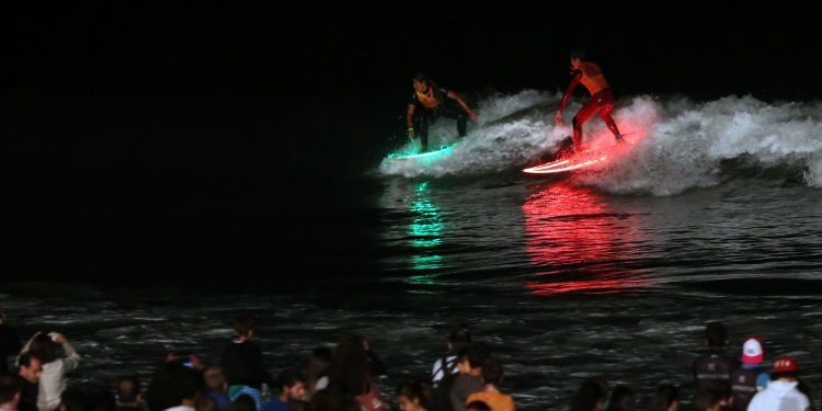 Mercadillo con expositores de innovadoras marcas, artesanía contemporánea, ropa, tablas, quillas y la música en concierto de Camarada Nimoy para un evento surfero que ya se ha convertido en un clásico del verano en la Ría de Vigo. Cientos de personas acudieron la noche de este lunes a la playa de Patos para ver en acción las tablas de surf más luminosas bajando las olas en plena noche.