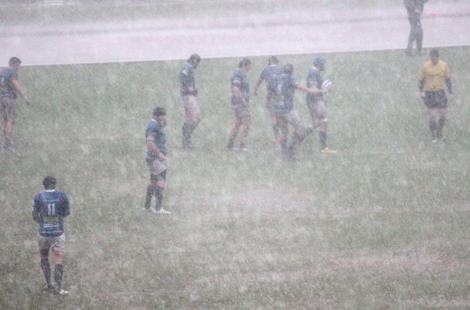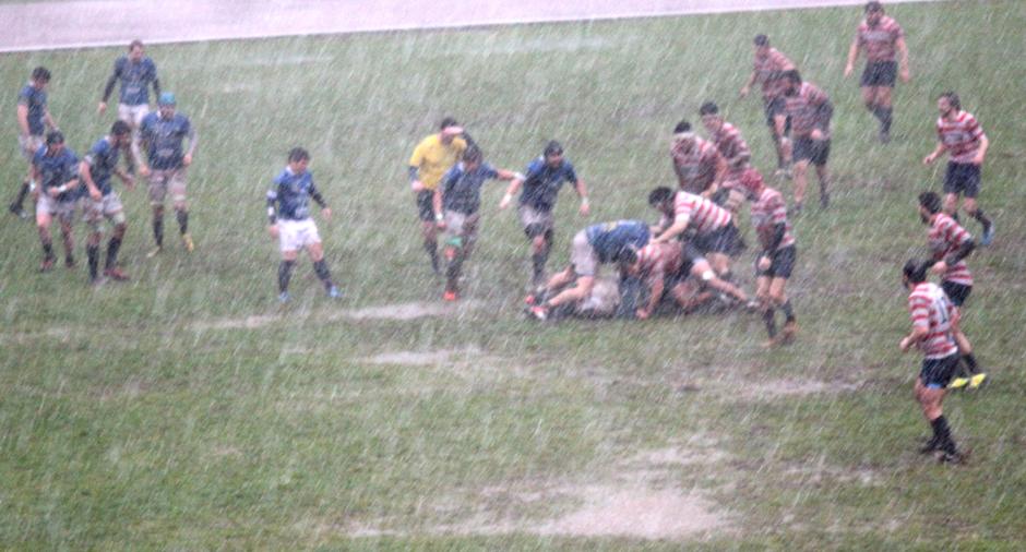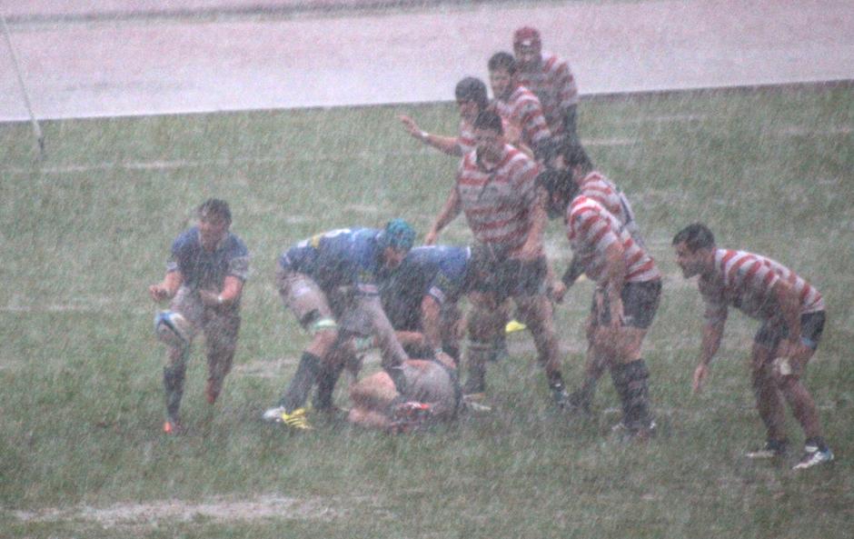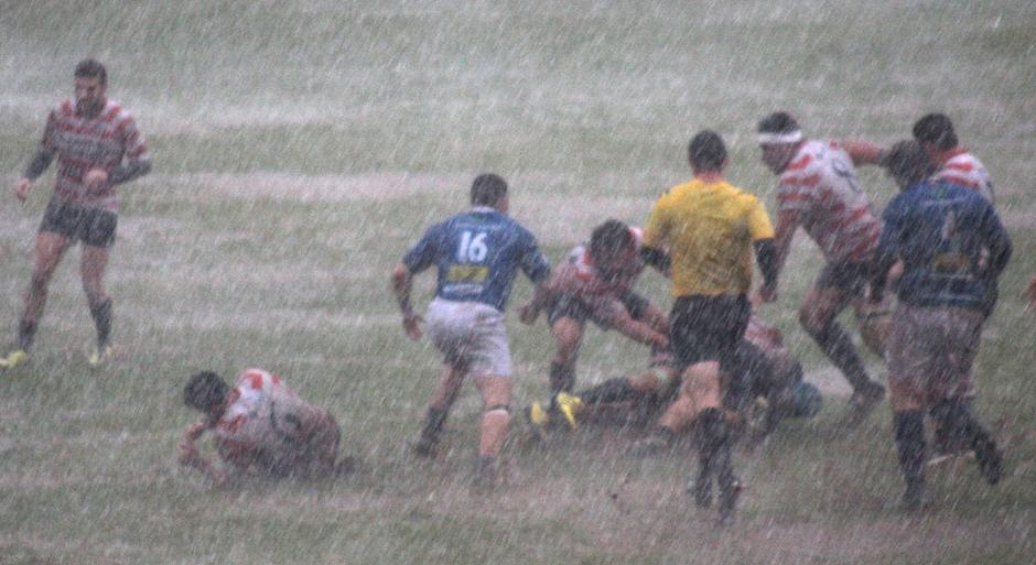 Y es que el pasado sábado coincidió el epicentro del temporal con el encuentro de rugby. Hace varias temporadas, en una jornada similar, el agua y el viento llegaron unas horas antes del partido de promoción de ascenso ante el CRC y hace un par de campañas se trasladó un encuentro a Pontevedra porque As Lagoas estaba impracticable. En ambos casos hubo solución. El pasado sábado no la hubo porque, por momentos, costaba distinguir a los jugadores sobre el campo por la lluvia y el viento. Un manto blanco cubría el horizonte. Hubo hasta cuatro lesionados en sólo 40 minutos. Y es que el cielo abrió las compuertas y dejó las siguientes fotografías. En muchas de ellas se puede ver como la lluvia llegaba a tapar a los jugadores. El objetivo no sabía lo que enfocar…