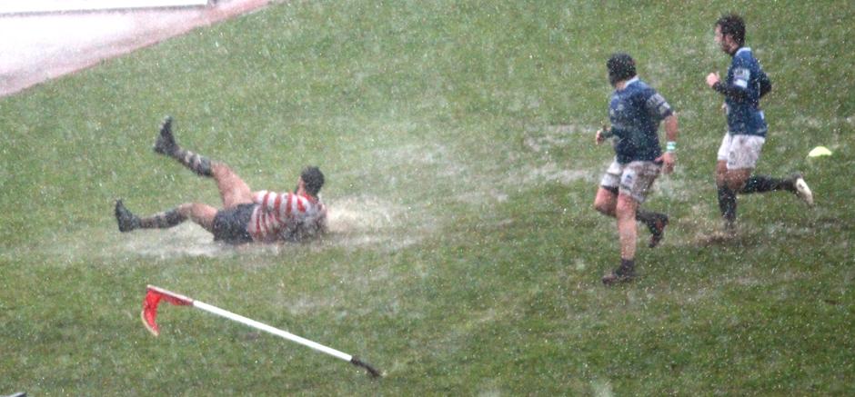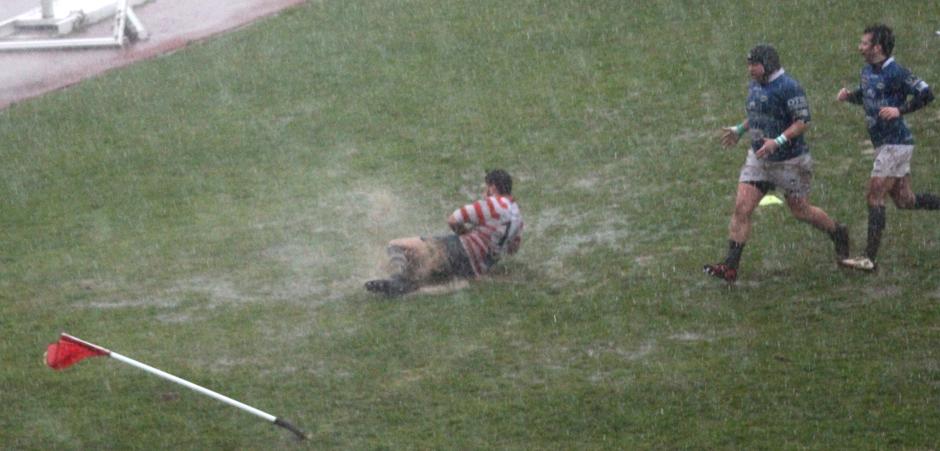 Fue lo que sucedió mediada la primera mitad en el campo de As Lagoas el pasado sábado entre el Blusens Networks Vigo Rugby y el Quesos Entrepinares B. El campo de As Lagoas, con charcos desde el inicio del partido, no aguantó más hasta quedar convertida la banda en una laguna. Tras muchas peticiones del equipo visitante, el colegiado tuvo que ceder en el descanso y se paró el partido.