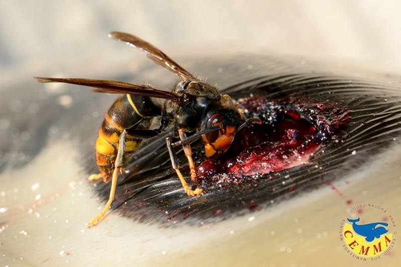 La Cemma alertan de la “magnitud” de esta “plaga” con una impactante imagen de una velutina recogiendo trozos de un ‘golfiño’ para alimentar a sus larvas