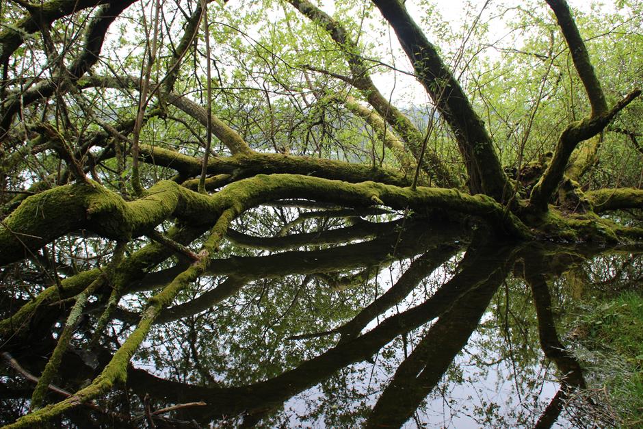 A orillas de un embalse completamente lleno a finales de abril, la vegetación cambia a un verde ostentoso, los senderos se separan y el camino es un paso estrecho de pies que acaricia el agua en muchos momentos. La zona destaca por su belleza y, aún así, surge la pregunta de ¿cómo sería sin embalse? No hay respuesta y los ojos disfrutarán de reflejos de casas y árboles sobre el agua. Tras aproximadamente un kilómetro que invita a la relajación se alcanza la parte alta donde confluyen los dos principales ríos de la zona. Hay un puente de madera y la ruta depara la última sorpresa.
