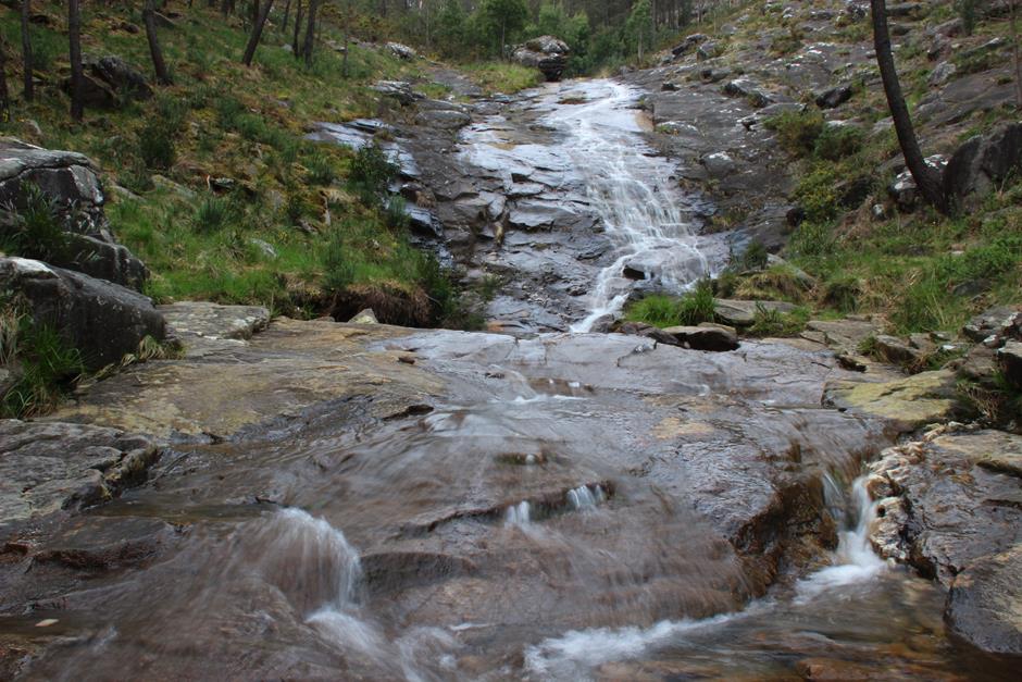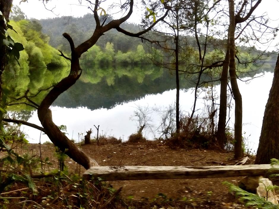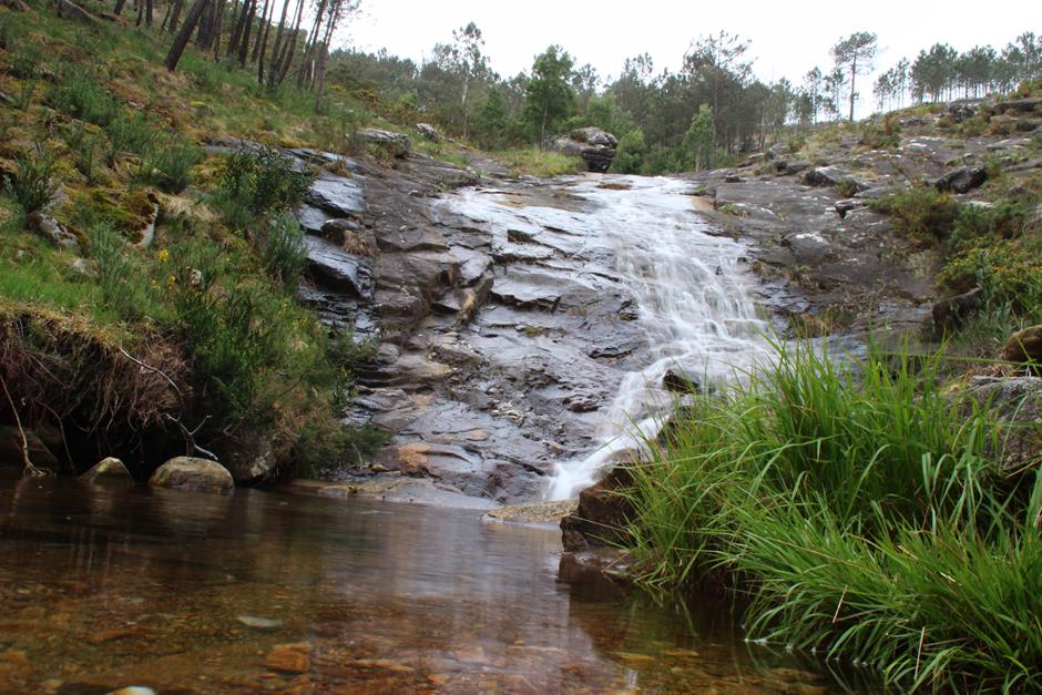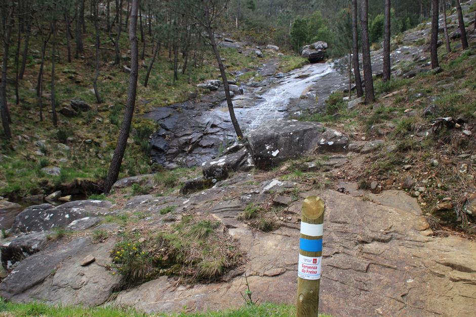 Con la compañía del los pinos, y tras varios requiebros, el camino llega a uno de los puntos de mayor interés, la Fervenza da Freixa, por la que ya merece la pena hacer el recorrido. Eso sí, más recomendable en primavera que en verano porque un elevado caudal de agua elevará su atractivo. Es uno de los puntos más altos y, a pesar de que el Galiñeiro aparece en el horizonte, un nuevo requiebro sirve al caminante para comenzar el descenso hacia el embalse de Zamáns. Al inicio, de forma leve. Después, con tramos de fuerte pendiente hasta llegar a la balsa de agua entre un frondoso bosque. Antes de pinos, ahora con predominio de eucaliptos. Unos metros que se comparten con el Sendeiro do Galiñeiro PR-G1 (raya amarilla).