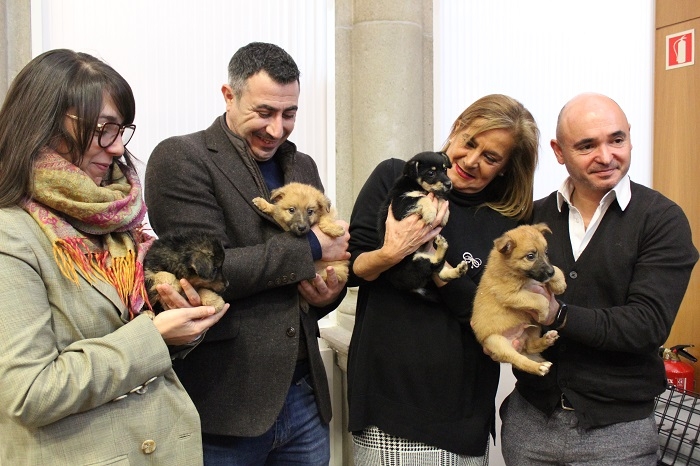 Carmela Silva compareceu con “Ares”, “Ceo”, “Terra” e “Sabela”, os catro cachorros abandonados nun colector en Vilanova que xa están fóra de perigo e sairán en adopción a vindeira semana. / Foto: Deputación de Pontevedra