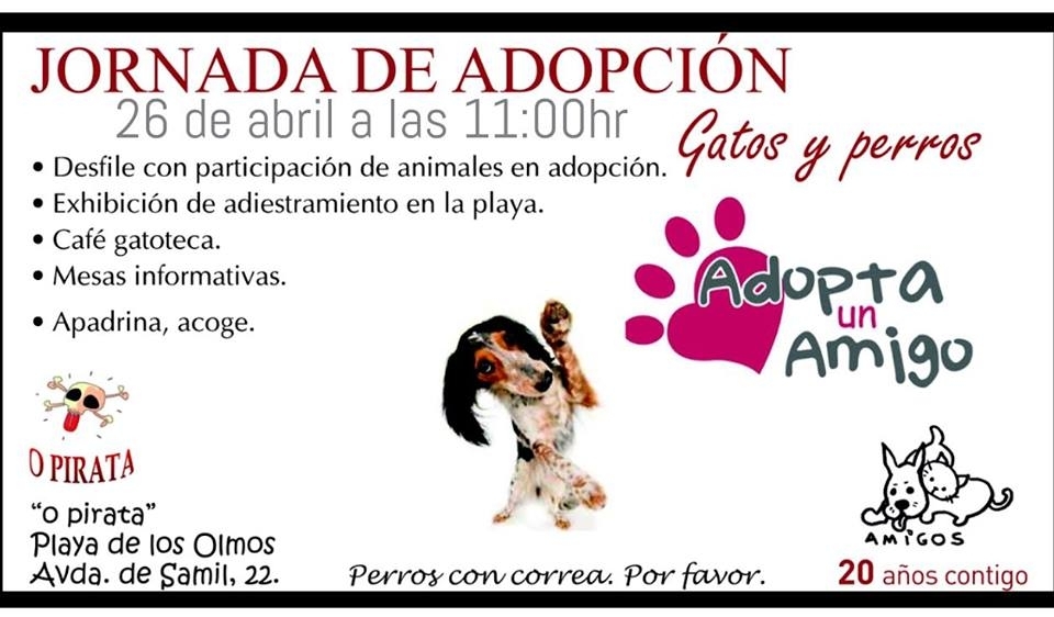 Con esa máxima, la clínica veterinaria Amigos ha decidido celebrar sus veinte años de existencia con una jornada de adopción, el próximo domingo, 26 de abril, en la que intentarán buscar nuevas familias para perros y gatos abandonados que se encuentran en las protectoras y asociaciones. En total, unas diez entidades participarán en este evento, que tendrá lugar a partir de las 11 horas en el entorno de la playa de Los Olmos y en el establecimiento O Pirata, que se convertirá durante unas horas en un café gatoteca donde los felinos contarán con una zona chill out en la que poder estar mientras sus dueños se toman un café.