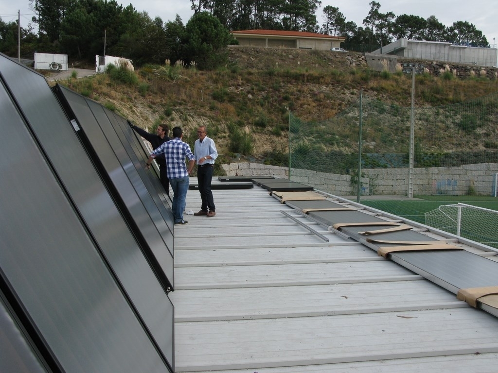 En total, foron instaladas enriba dos vestiarios 19 placas solares de 2,3 metros cadrados de superficie que manterán ao novo acumulador de 3.000 litros con auga a 60 graos centígrados.