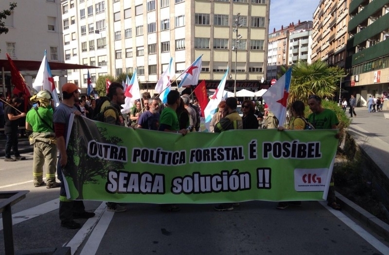Varios centos de traballadores de Seaga participaron este luns na manifestación convocada pola CIG para denunciar a precariedade laboral que padecen os empregados da compañía pública e rexeitar a política de prevención e extinción de lumes forestais que aplica o Goberno galego.