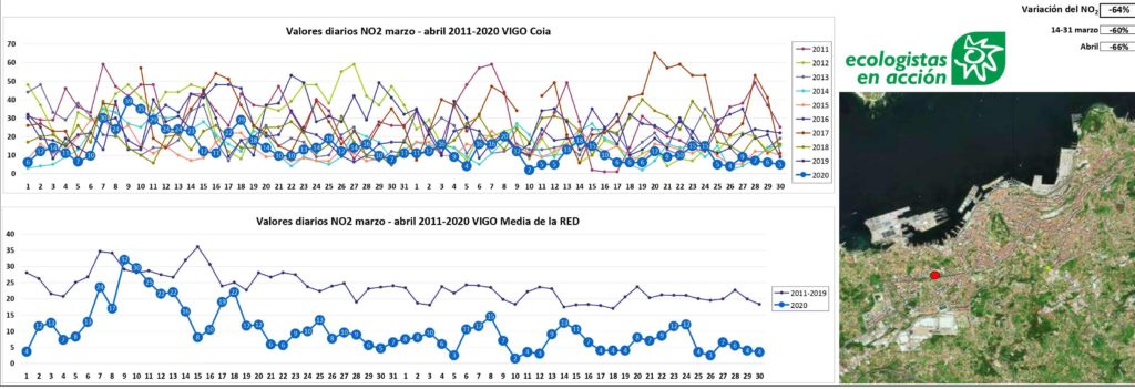 El resultado de la ciudad olívica se tomo en base a la estación de Coia entre los días 1 de marzo y 30 de abril en comparación con los diez años anteriores (desde 2011). Tan solo bajó más la contaminación en Alicante (72%), Valencia (69%), Córdoba (68%), Cádiz y Palma (67%). En A Coruña descendió un 52%, mientras que en otras ciudades del norte tampoco se llegó a los límites de Vigo, como Bilbao (46%), Gijón y Zaragoza (58%), Santander (62%) o San Sebastián(49%).
