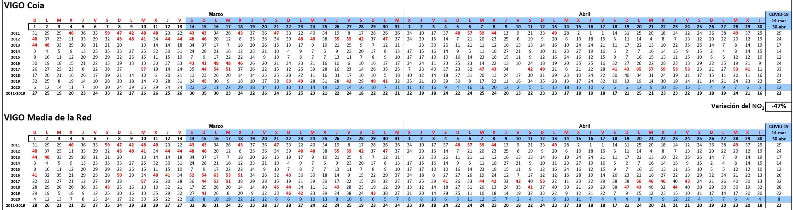 El resultado de la ciudad olívica se tomo en base a la estación de Coia entre los días 1 de marzo y 30 de abril en comparación con los diez años anteriores (desde 2011). Tan solo bajó más la contaminación en Alicante (72%), Valencia (69%), Córdoba (68%), Cádiz y Palma (67%). En A Coruña descendió un 52%, mientras que en otras ciudades del norte tampoco se llegó a los límites de Vigo, como Bilbao (46%), Gijón y Zaragoza (58%), Santander (62%) o San Sebastián(49%).