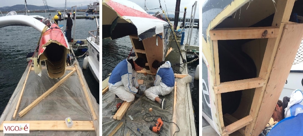 El trabajo de sellado del flotador de babor lo están haciendo colocando el mismo sobre el pantalán en el que está amarrado el “FenêtréA Cardinal”. Y a base de tableros, maderas y fibra intentarán sellarlo lo mejor posible para que pueda aguantar una navegación de vuelta a su puerto base por las aguas del golfo de Vizcaya.