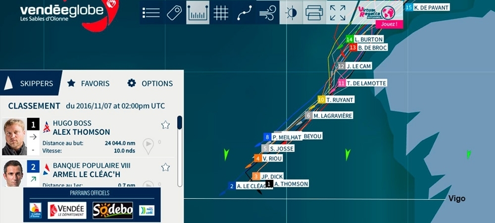 Los vientos favorables en el golfo de Vizcaya permitieron que la flota alcanzase las costas gallegas esta mañana. Los navegantes solitarios han podido exigirles un buen ritmo a sus veloces veleros, con velocidades medias superiores a los 16 nudos. Velocidades que les ha dado alas para que a las tres de esta tarde empezasen a cruzar el paralelo de Vigo (* Latitud: 42.2154941). El primero ha sido el “Hubo Boss” del británico Alex Thomson, seguido del francés Armel Le Cléac´h con el “Banque Populaire VIII”, a 0,7 millas del primero.