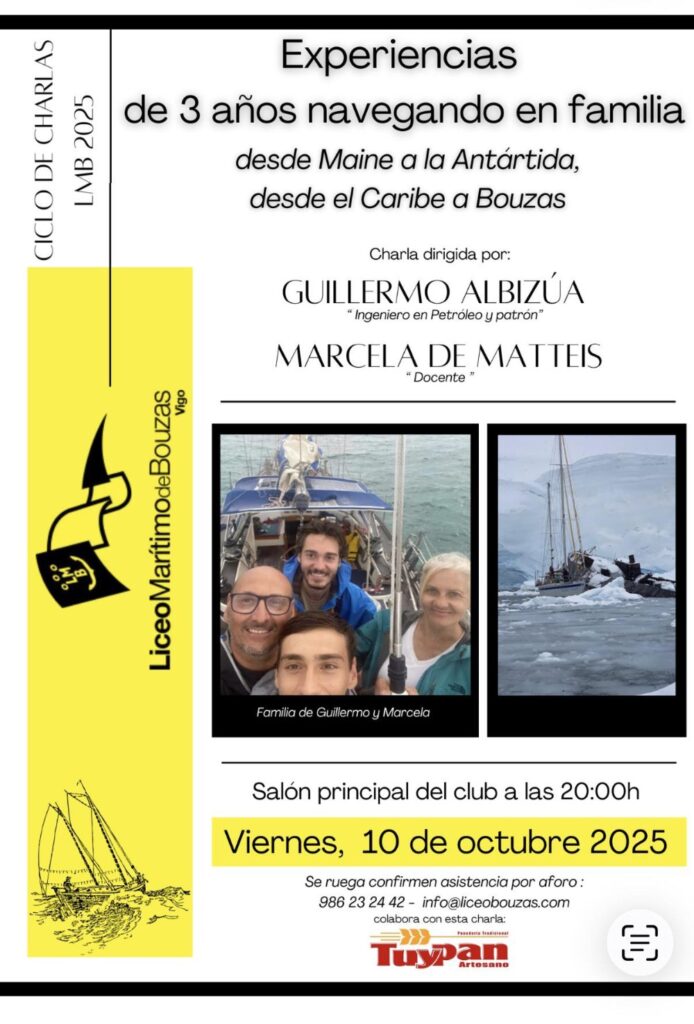 Este viernes, 10 de octubre, a partir de las 20 horas, Albizua y su esposa Marcela De Matteis compartirán sus vivencias en el Liceo Marítimo de Bouzas dentro del ciclo de charlas náuticas. Bajo el título “Desde Maine a la Antártida y desde el Caribe a Bouzas”, relatarán cómo un sueño sabático se transformó en una filosofía de vida nómada, marcada por la libertad y el respeto al océano.