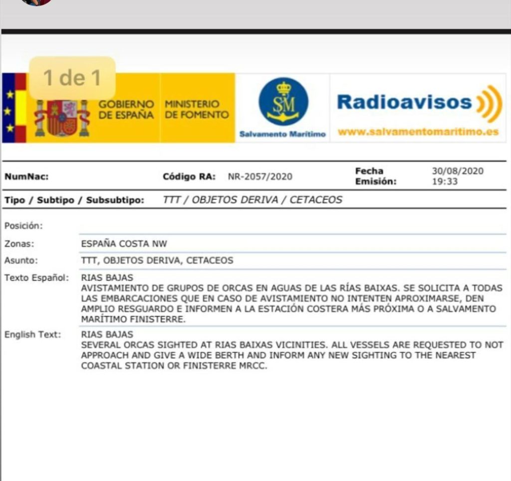 El radio aviso de Salvamento que reproducimos hace mención al grupo de orcas e insiste no solo en no acercarse a ellas sino alejarse todo lo posible en caso de avistamiento. Además, también solicitan colaboración para informar a las autoridades.