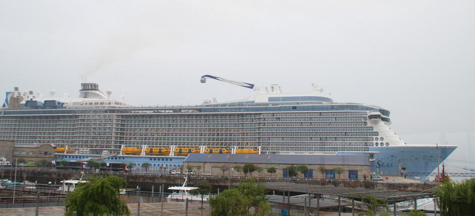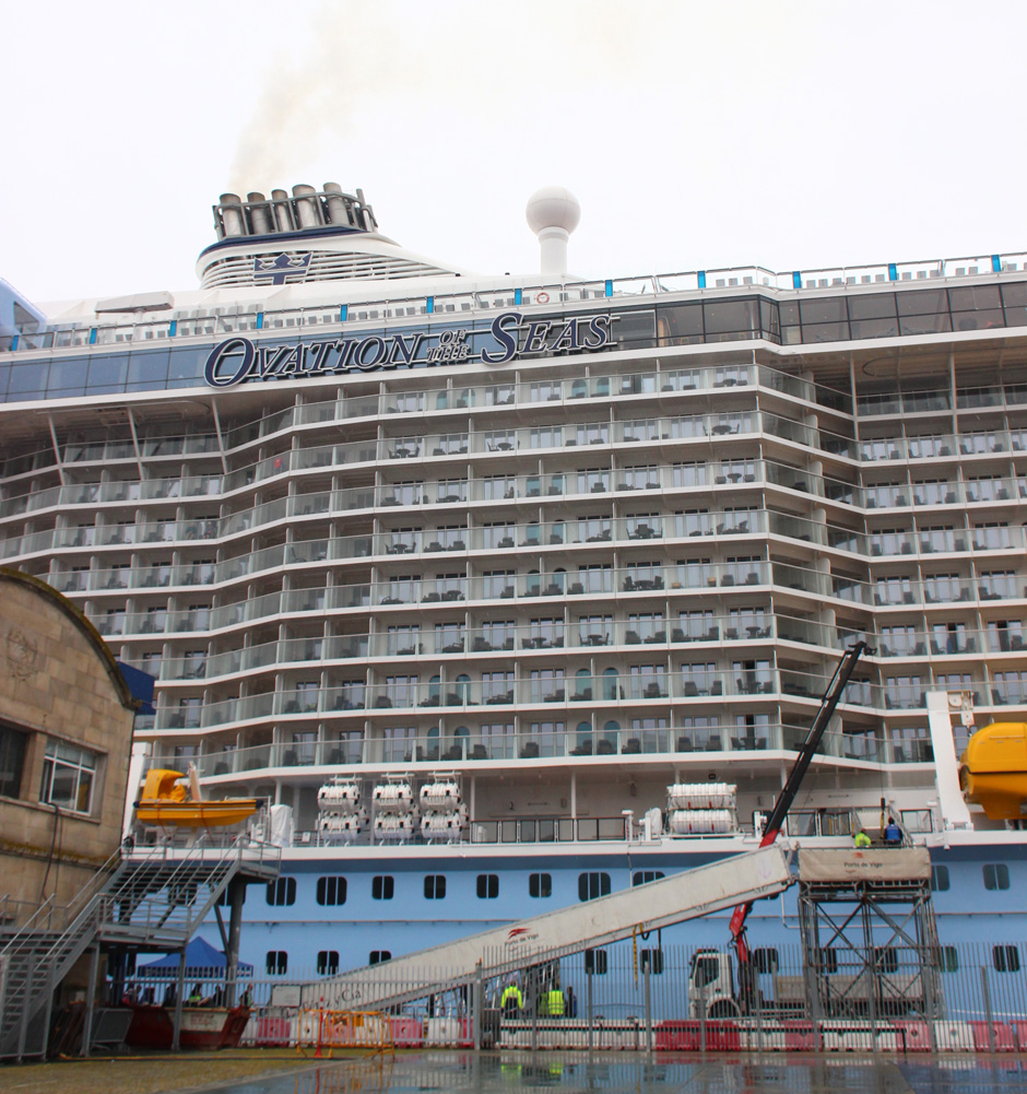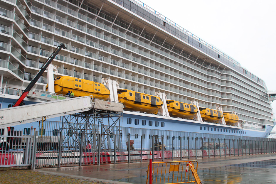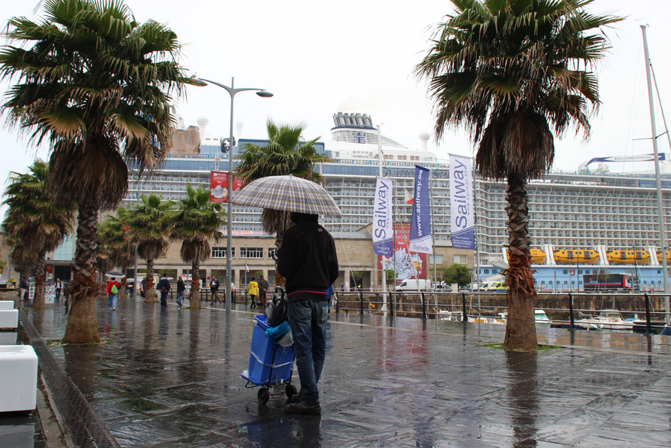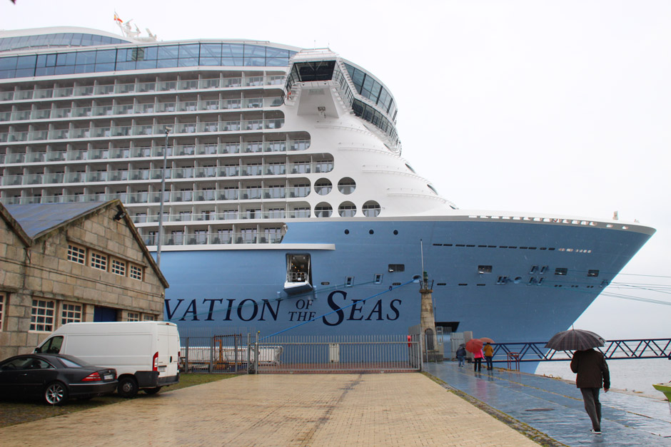 El trasatlántico dejó un buen número de turistas en Vigo que limitaron sus paseos debido al agua. La zona de A Laxe presentaba un magnífico aspecto con multitud de visitantes, pero las calles tenían menos colorido del habitual en estos casos. Mientras, los vendedores de paraguas trataba de hacer su particular agosto a comienzos del mes de mayo.