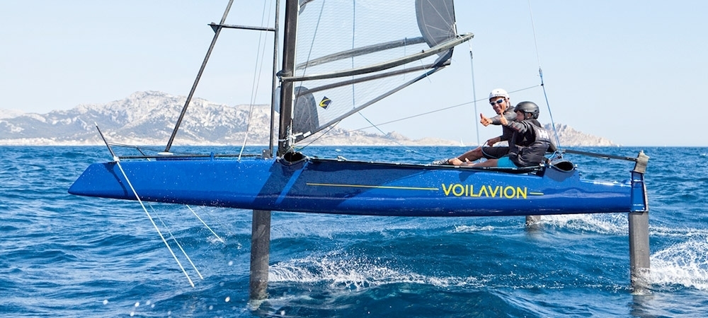 En 2011 se puso en marcha el proyecto “VoilAvion”, una palabra que aúna dos grandes pasiones, la vela y la aviación. A diferencia de los demás inventos voladores, utiliza como plataforma un catamarán sobre el que se instala un aparejo que bascula unos 35 grados a cada banda al desplazarse la base del mástil sobre un carril montado en el travesaño de proa. Y lleva cuatro foils en forma de “T”, dos en popa, en cada timón, y dos en proa en cada orza; los de popa se regulan con el cañin, y los de proa con los “wands” –traînards en francés- barras de trimer o “varita mágica”.