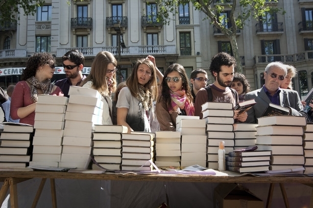 O Sant Jordi (23 de abril, Día Mundial do Libro) é o día máis importante para o mundo do libro en España. Para que vos fagades unha idea da súa relevancia, o ano pasado saíu á rúa só en Barcelona máis dun millón e medio de persoas. E aínda que en realidade non haxa nada de “obrigatorio”, que aquí a ninguén se lle esixe mercar nada (que o Diaño Catalán é moi malo e cheira a xofre, si, pero non lle pon a pistola a ninguén para que faga gasto se non quere), curiosamente a xente si decide mercar libros. E tanto que o fai! Segundo os datos ofrecidos pola Conselleria de Cultura, en colaboración co Gremio de Libreros e o Gremio de Editores de Cataluña, no pasado Sant Jordi os libreiros declararon unhas vendas superiores aos 20.000.000 de euros (por se hai algún animaliño entre o público, un 2 seguido de tantos ceros veñen sendo uns vinte millóns de euros, facturados nun só día!), repartidos entre máis de 1.600.000 exemplares. Que veña aquí un só libreiro galego a dicirme o que non daría por poder anotar eses mesmos números nos seus libros de contas, aínda que nada máis fose por un mes…