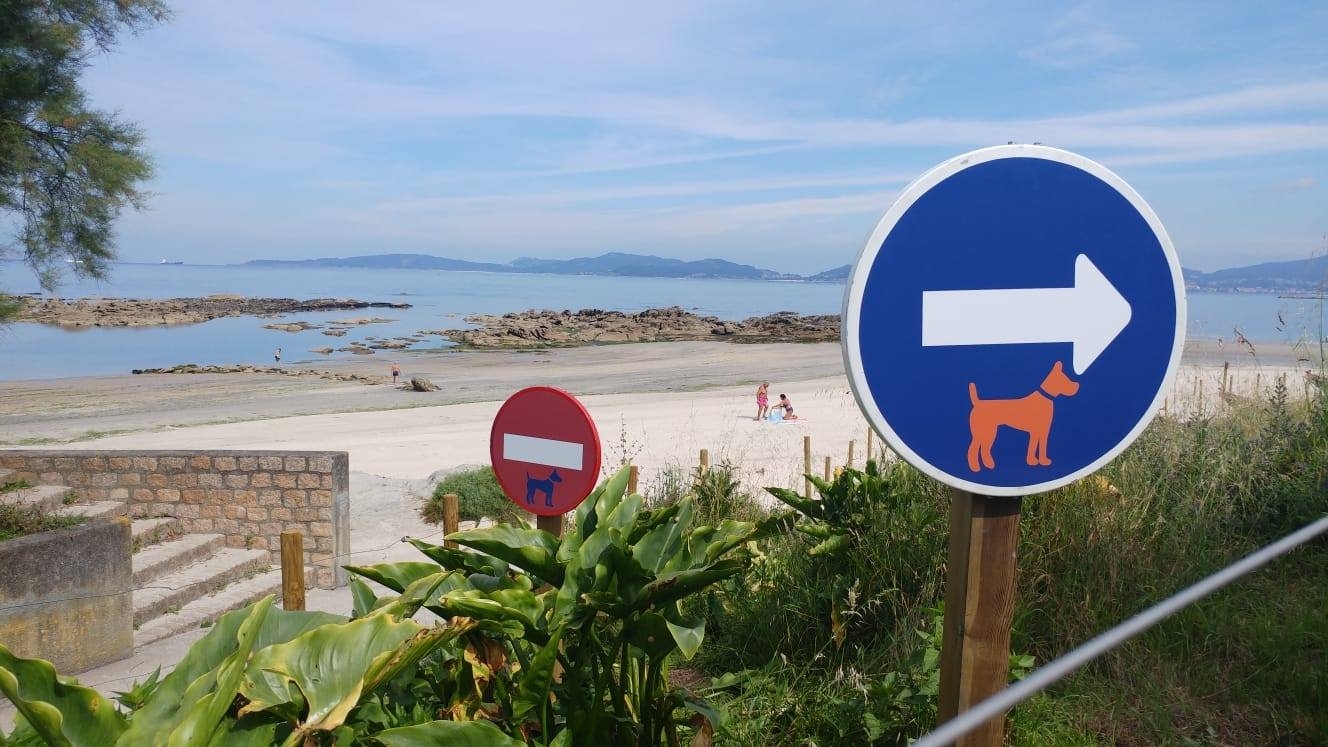 Como no parecen suficientes tres carteles bien grandes en tres zonas diferentes, en los que se indican las delimitaciones y normas de la playa canina, así como dos postes de madera en medio del arenal también con carteles, ahora se suman señales de tráfico de direcciones prohibidas y obligatorias con un perrito dibujado.