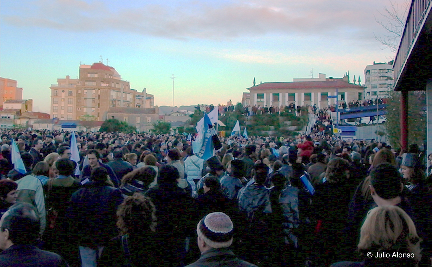 Pero toda esa transformación de la que ahora hablamos también afectará a las manifestaciones de celebración o de repulsa. Esta fotografía, por ejemplo, corresponde a una de las manifestaciones de “Nunca máis”, cuando fue la crisis del Prestige, en la plaza del Concello de la ciudad de Vigo. Durante la crisis del Prestige, que dio lugar a una enorme catástrofe ecológica, el Partido Popular demostró una gran incapacidad y una nefasta gestión de la situación.