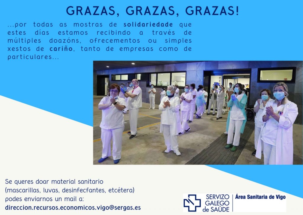 Desde el área sanitaria de Vigo los profesionales siguen trabajando duro para hacer frente a todos los casos. Además de agradecer nuevamente el apoyo que está mostrando la ciudadanía desde sus balcones, han querido reconocer a todas las empresas y particulares las numerosas donaciones realizadas estos días. Igualmente, facilitan un contacto para canalizar las entregas.