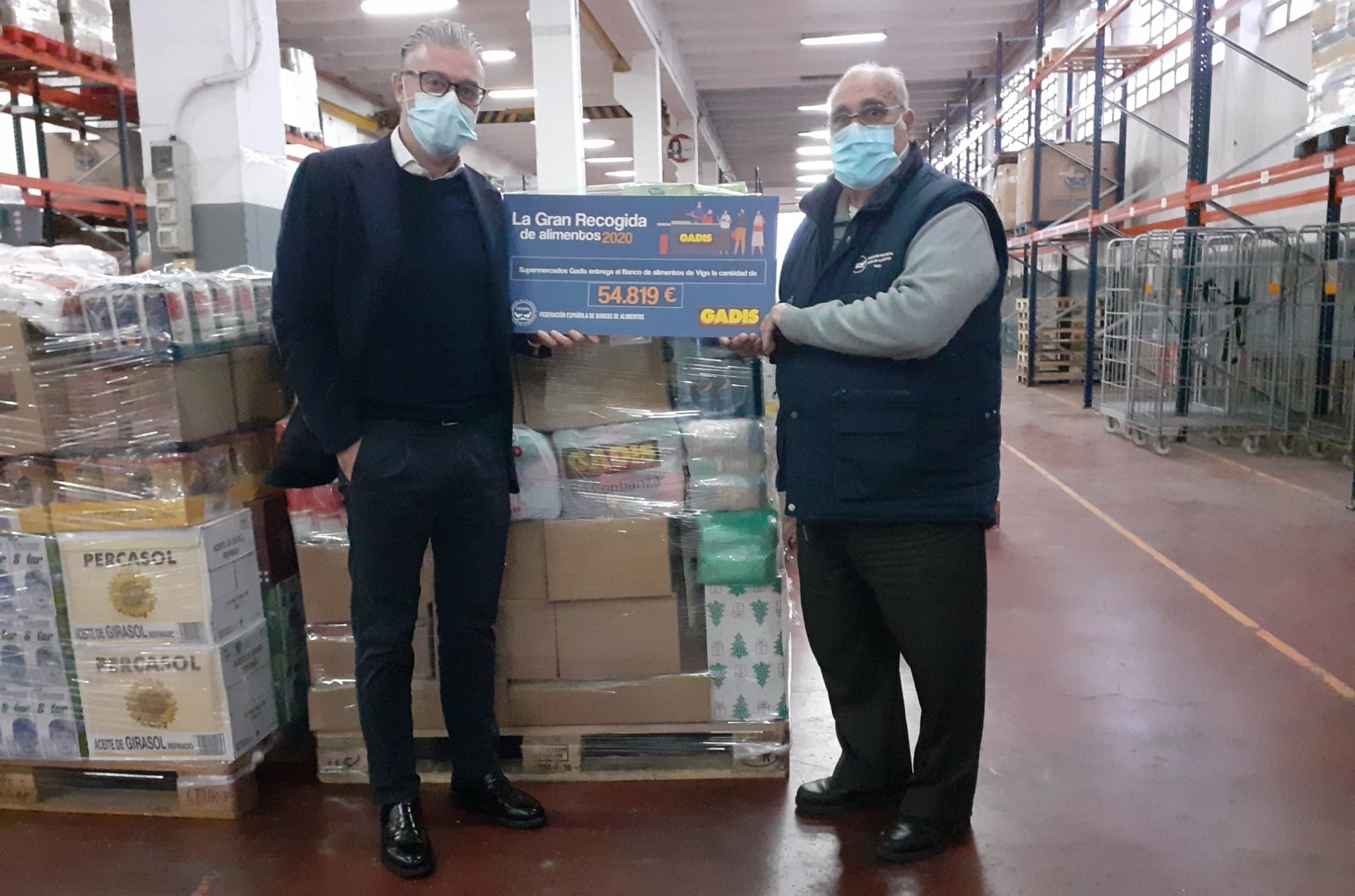 Gadis ha entregado al Banco de Alimentos de Vigo los 54.819 euros aportados por clientes de la provincia de Pontevedra a la campaña solidaria ‘La Gran Recogida’. El delegado de GADISA en Pontevedra, Pablo Louro, ha hecho la entrega del importe en vales de compra de Supermercados Gadis a Apolinar Quinteiro, representante de la entidad.