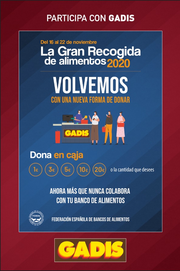 Supermercados Gadis colabora con La Gran Recogida desde 2014. En la campaña del año pasado, se recogieron más de 250.000 kilogramos de productos gracias a la generosidad de los clientes. En esta ocasión, la empresa canjeará la donación económica por productos que se ajusten a las necesidades de los bancos de alimentos.