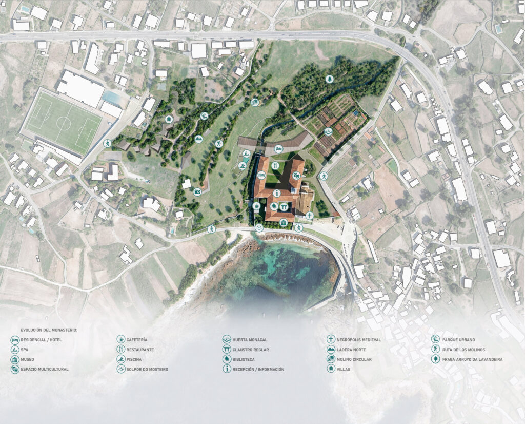 El jurado valoró en este caso el planteamiento «respetuoso» y «el compromiso de recuperar no solo un conjunto patrimonial singular, sino también el modelo sostenible que sostuvo históricamente la relación del Mosteiro con la villa y con el entorno».